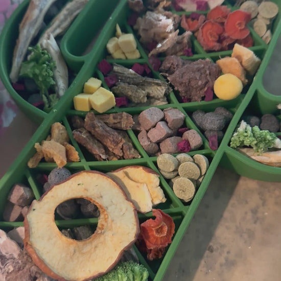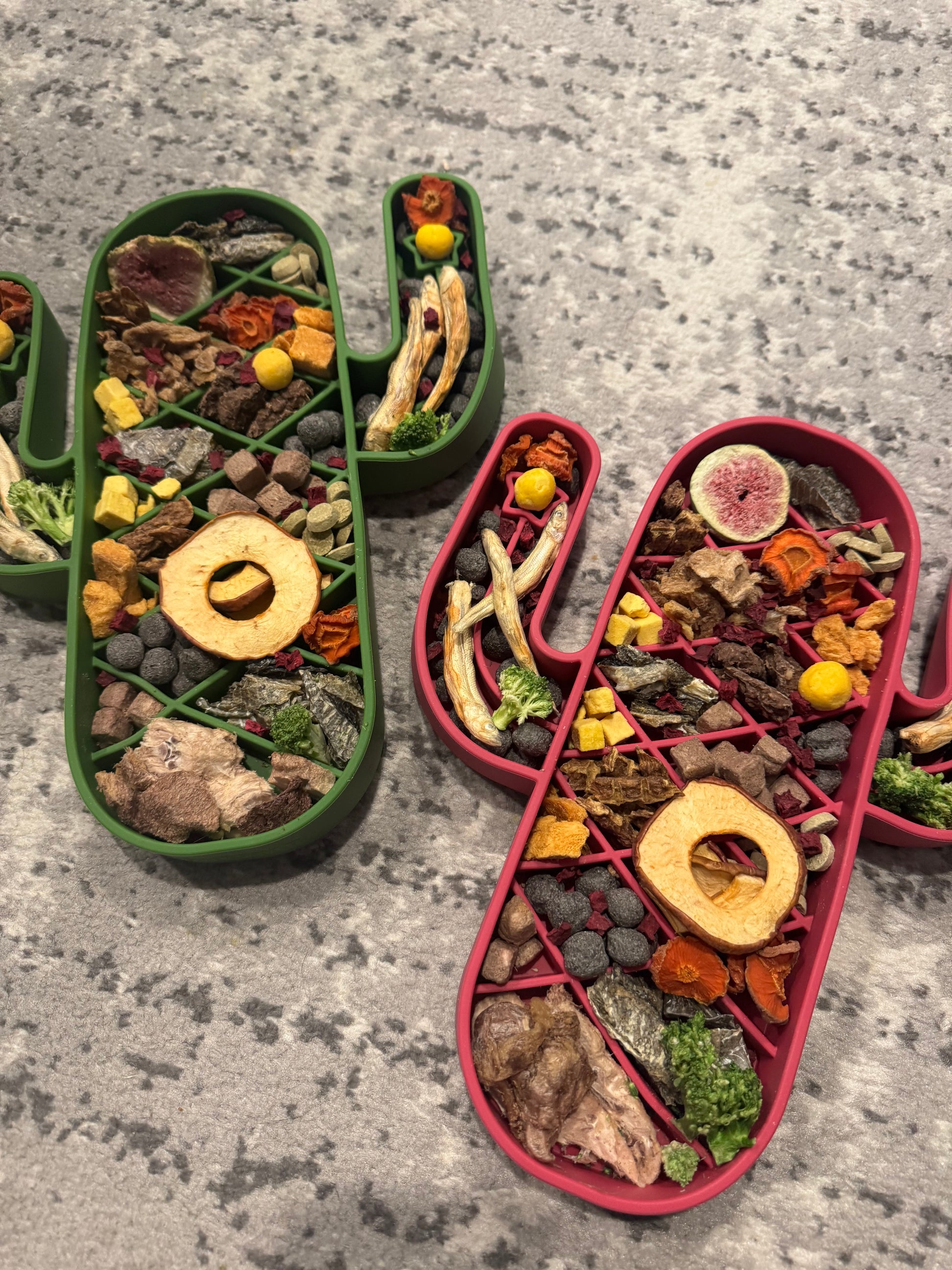 The Saguaro Slow Feeder can hold up to 2 pounds of raw food or 3 cups of kibble (maybe more for both) Whether you’re an enrichment pro or don’t know what enrichment is, this slow feeder is perfect for your pups next meal. The main design features divided sections so you can separate all different types of food throughout the feeder.