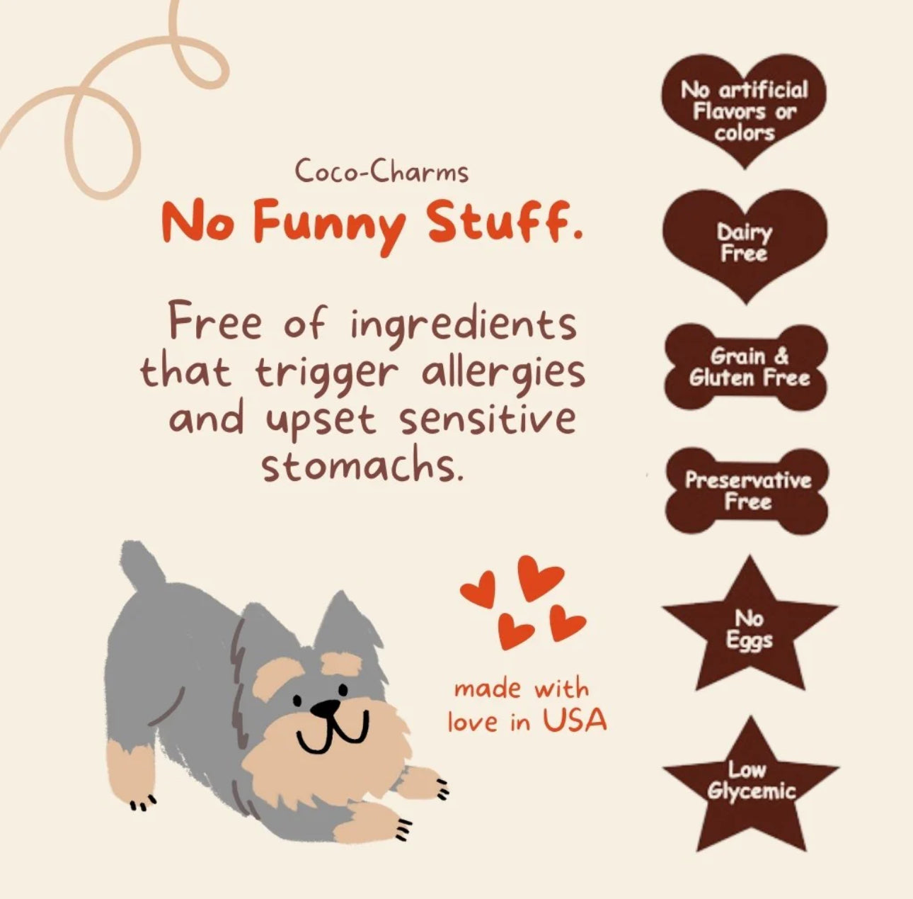 CocoTherapy Coco-Charms are vegan, grain and gluten free, dairy free, no eggs, and made with no preservatives, colors, or artificial flavors. This means dogs with allergies and sensitive tummies can enjoy them and benefit from them as well!