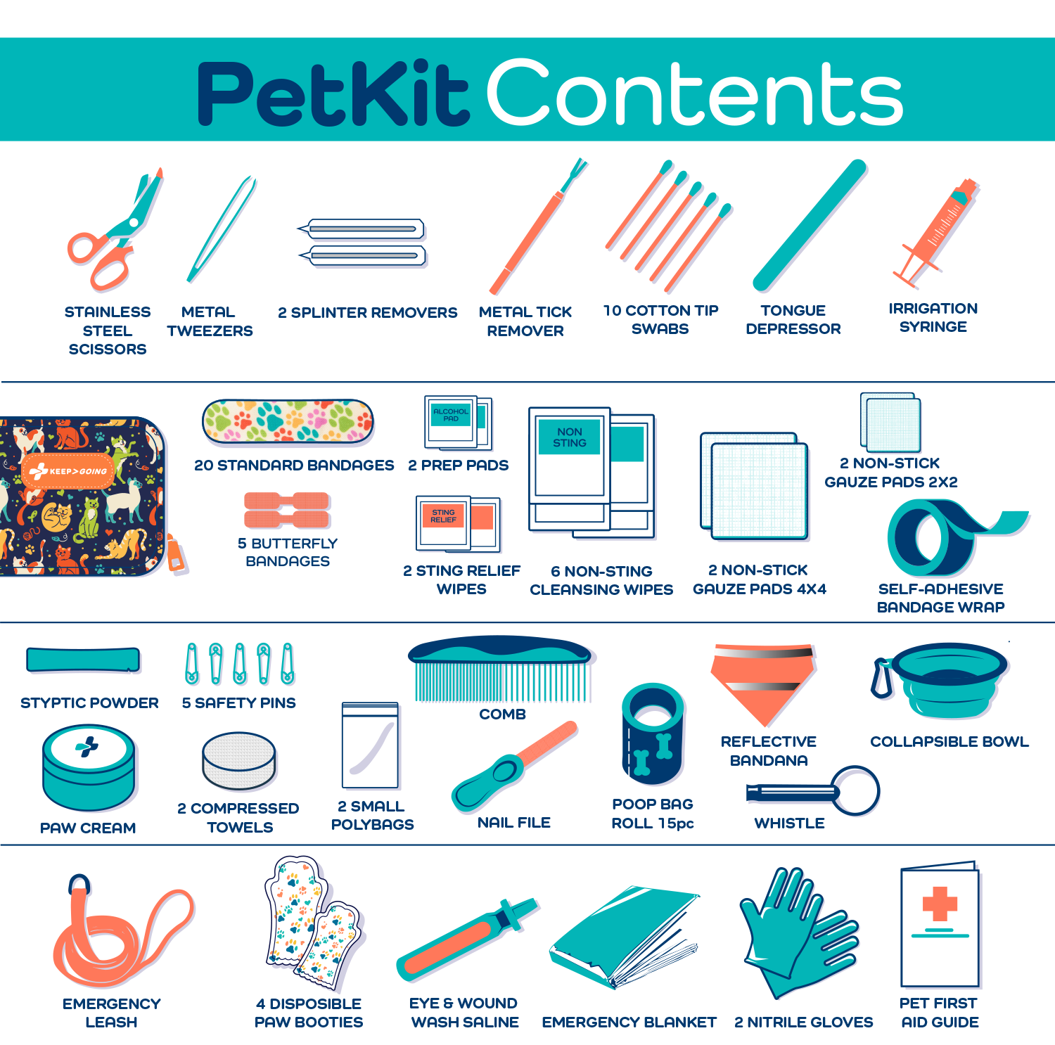 * Includes everything you need! Tick Remover, Comb, Water Bowl, Emergency Leash, Reflective Bandana, Styptic Powder, Eye Wash, Paw Cream and so much more!