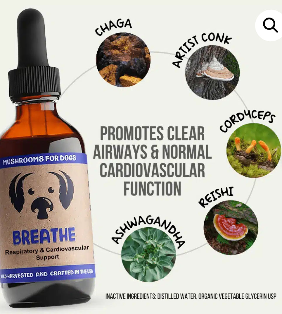 Reishi and Artist Conk are traditionally used to help maintain respiratory wellness, especially in breeds with shorter snouts that may benefit from clear nasal and airway support.