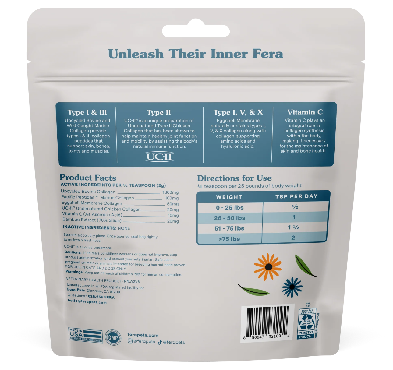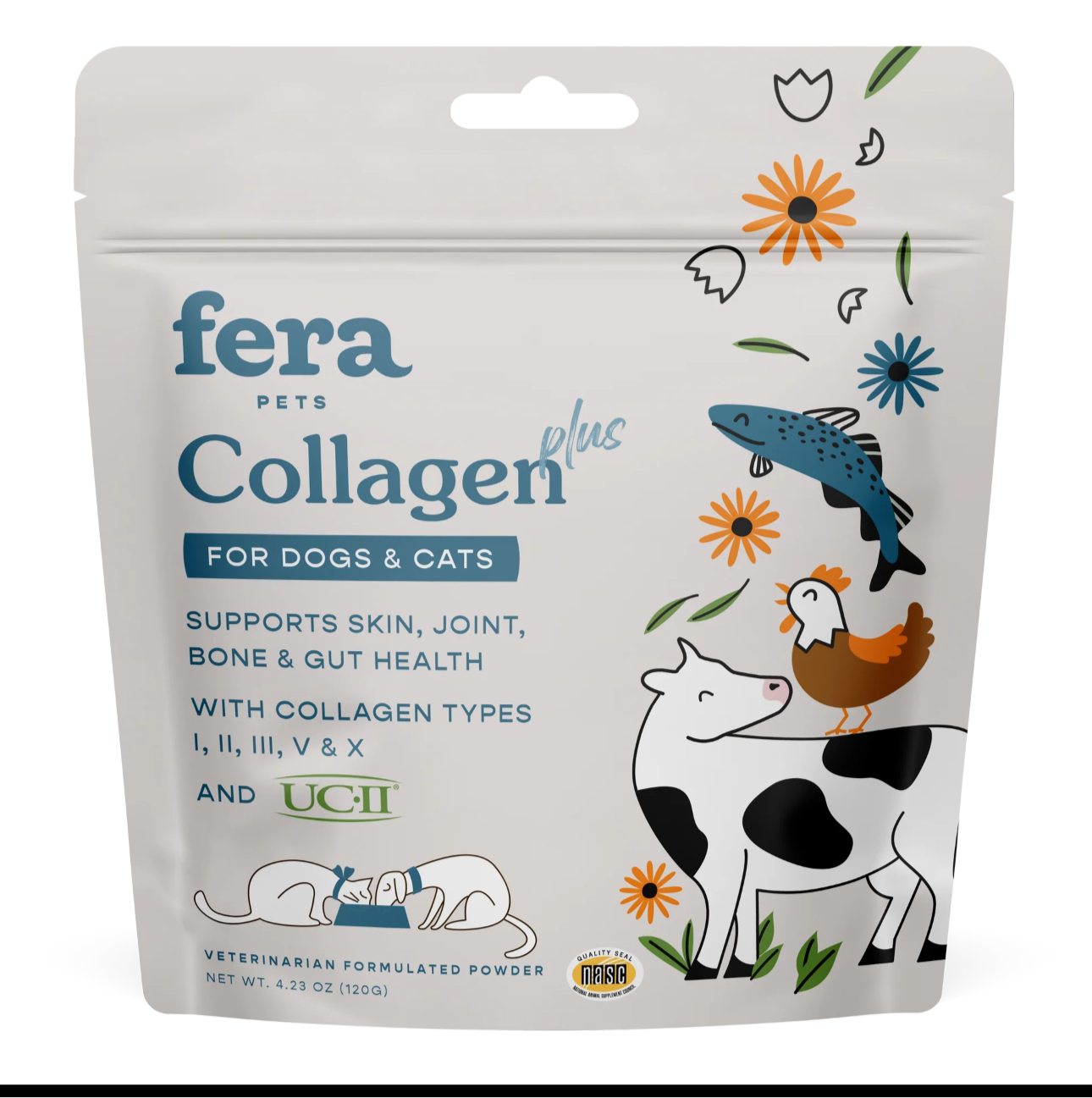 We strive to keep our pets healthy and active. Fera's Collagen Plus contains full spectrum support for your pet's active lifestyle with types I, II, III, V, & X collagen.